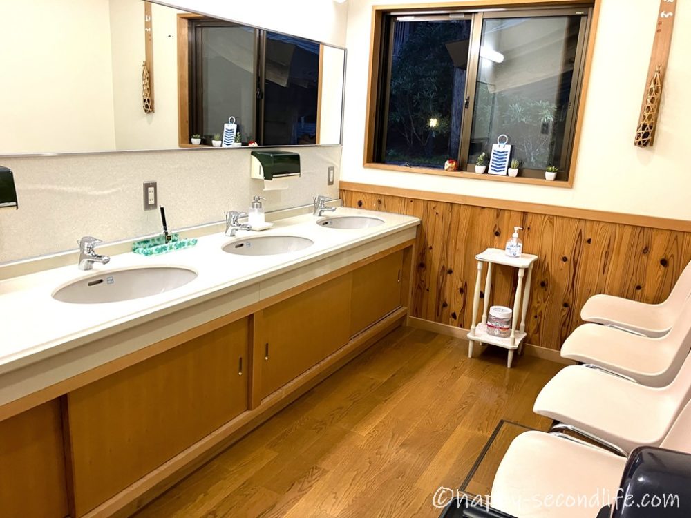 共用の洗面台は必要にして十分。この背後にトイレがあります。どちらもきれいに掃除されていました。ご苦労さまです。