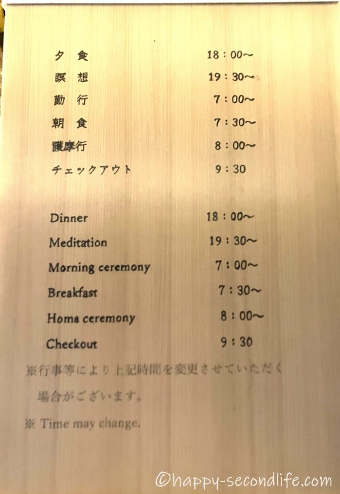 大広間の入口に予定表がありました。分かりやすくていいですね。私が泊まったのは8月のお盆のころだからでしょうか。朝は護摩行(ごまぎょう)が先でその後朝食でした。