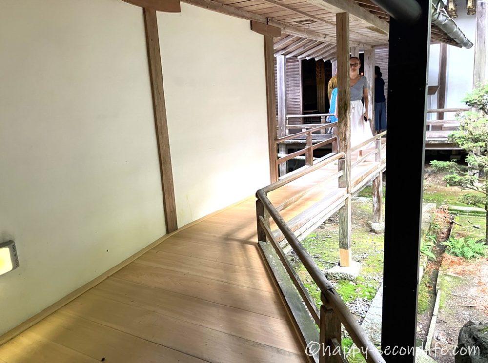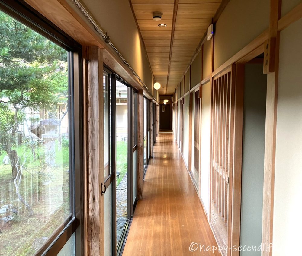 お庭を見ながらぴかぴかの廊下を進んで
