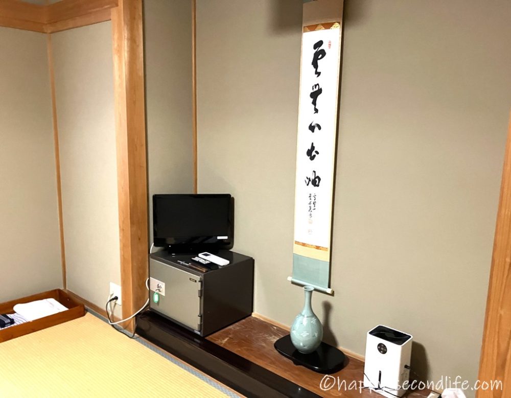 床の間には掛け軸、そして金庫とTVもありました。エアコンもあります 笑