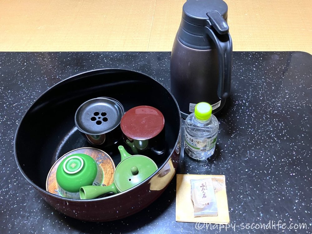 ポットにはお湯、お茶セットとお菓子があり、旅館と変わりません。