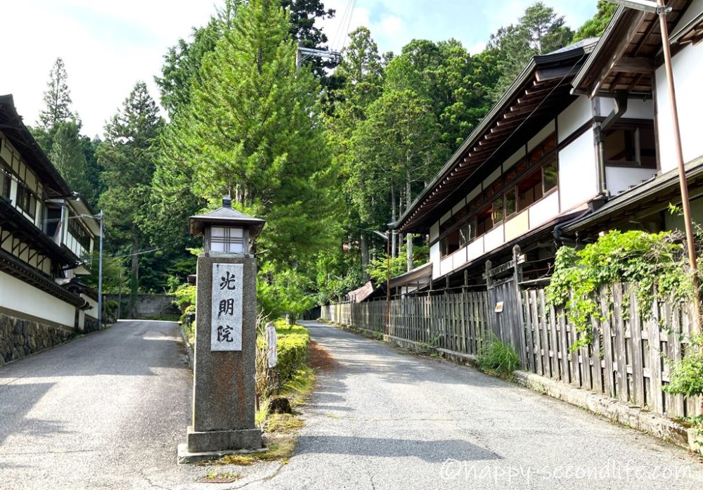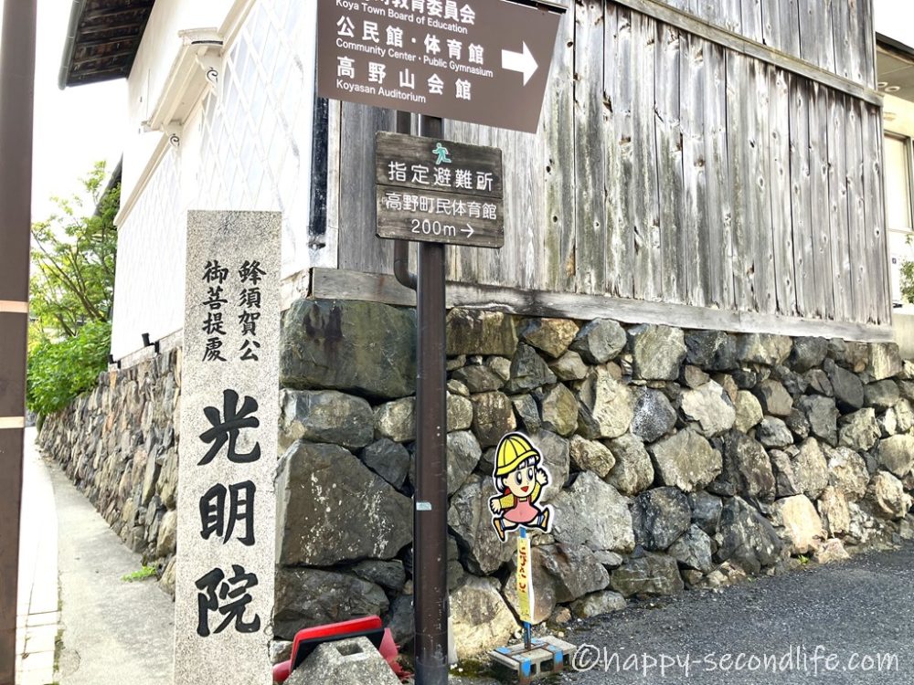 高野山駅前はバスターミナルになっていて、各方面のバス便が充実しています。タクシーもあります。メイン通りを行くバスに20分ぐらい乗って「苅萱堂(かるかやどう)前」で降ります。「光明院」は進行方向の右側にありますので、道を渡ってから路地に入ります。