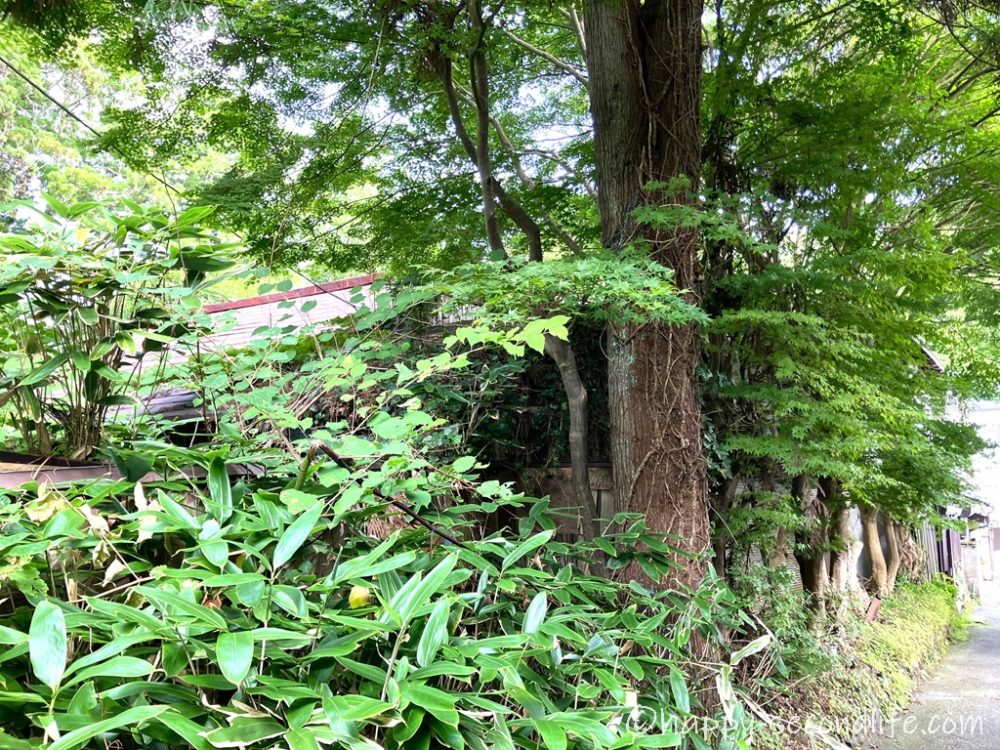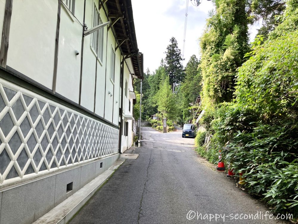 左側は白い壁が続いて右側は緑豊かな雑木林