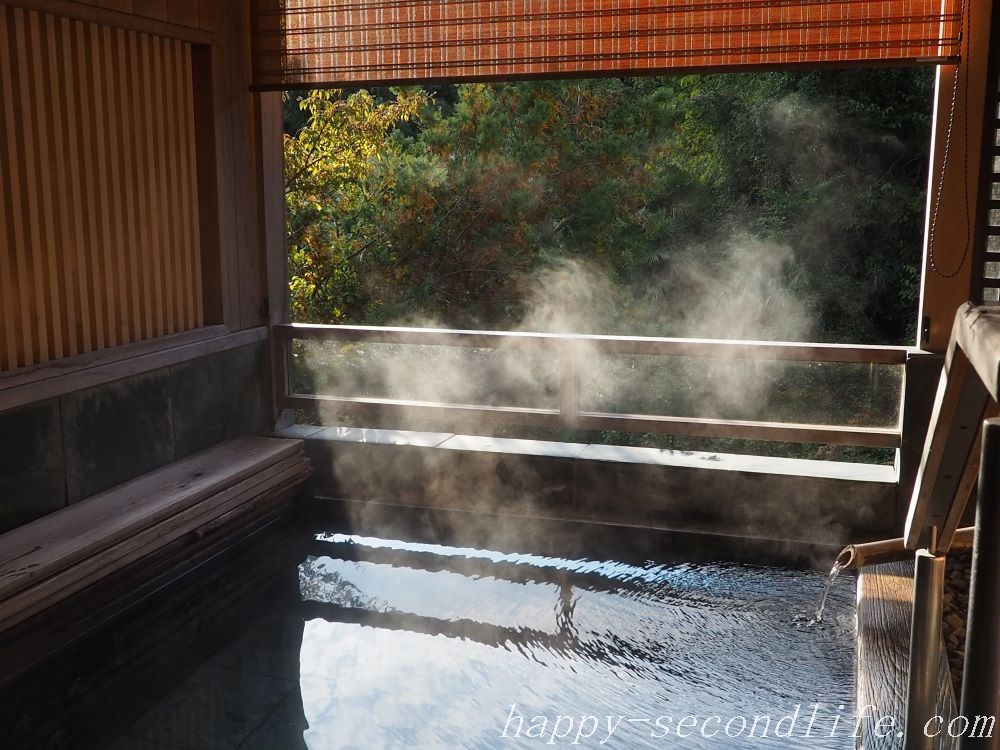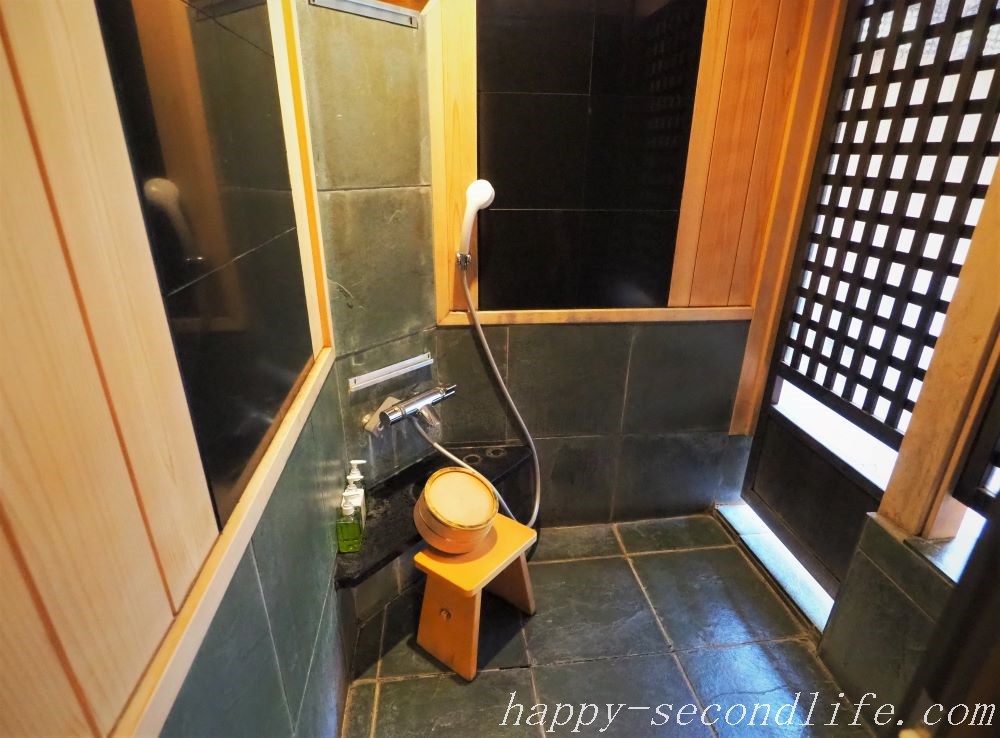 「万葉」の場合は源泉かけ流しの温泉です。たっぷりのお湯、広々した湯舟、洗い場は独立しており使い勝手よくできています。手すりや加水のための蛇口、すだれもあり、脚の悪い人や熱いお湯が苦手な人、外からの目(外は森ですが・・)を遮断したい人にも配慮されています。