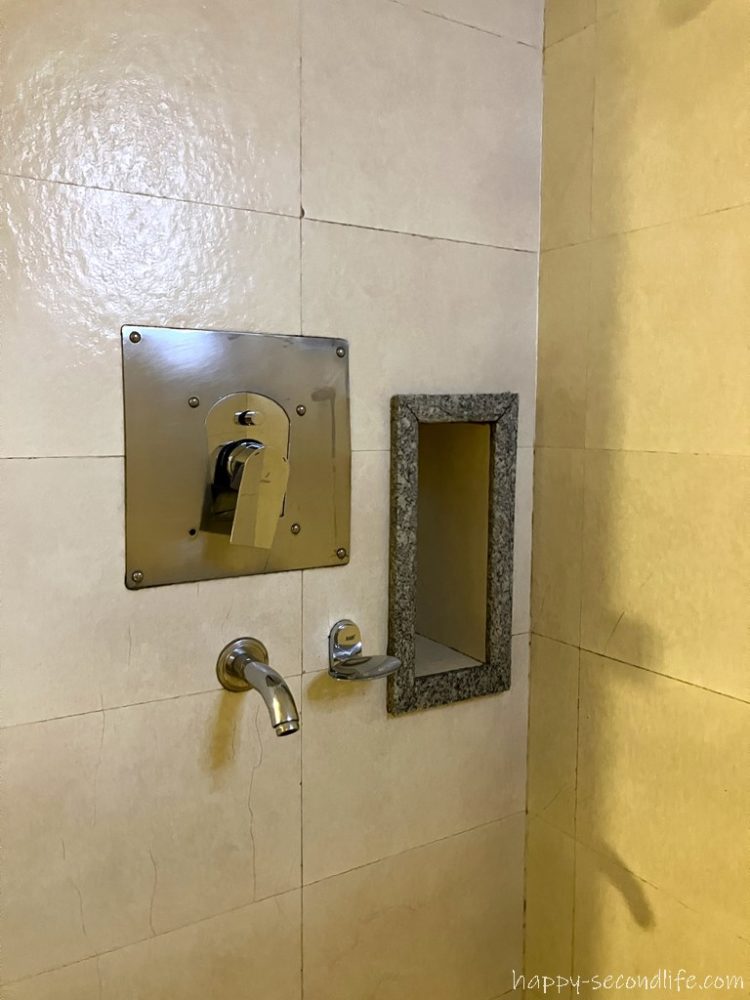 シャワーは固定式。まぁ、仕方ないですね。バスタブはありませんが水圧も温度も十分でした。停電が多いネパールでは、お湯が止まらずにシャワーが浴びられるのはありがたいです。