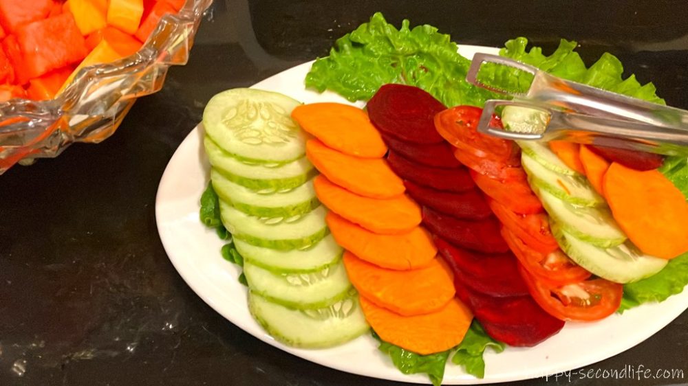 この野菜の並べ方、他でもよく見ました。料理教室でも「5ミリぐらいに薄く切って」と言われたっけ。簡単で見栄えも良くていいなぁ。帰ったらやってみようと思います。
