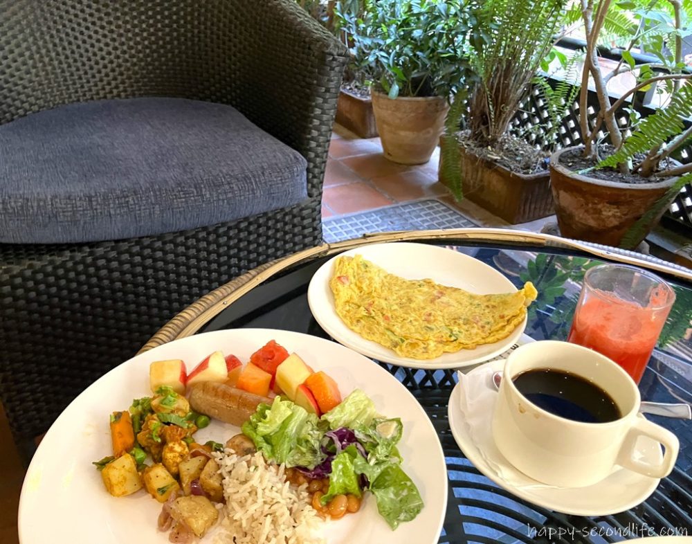観葉植物の鉢が並んだオープンエアーのテラスが素敵で、ここでまったりと過ごしたいと思ったのでした。