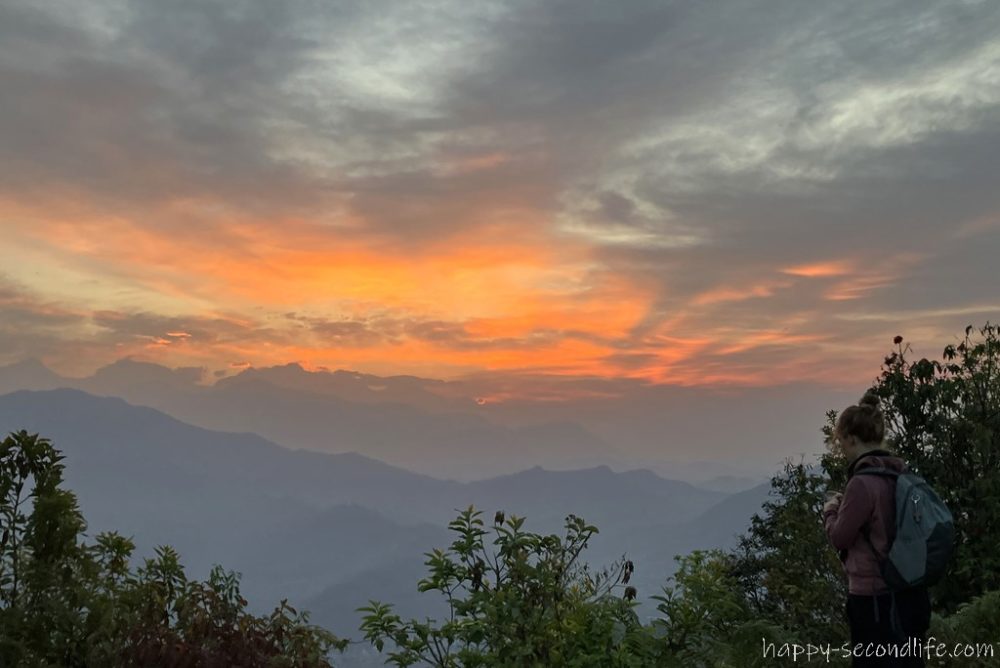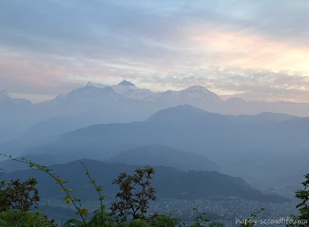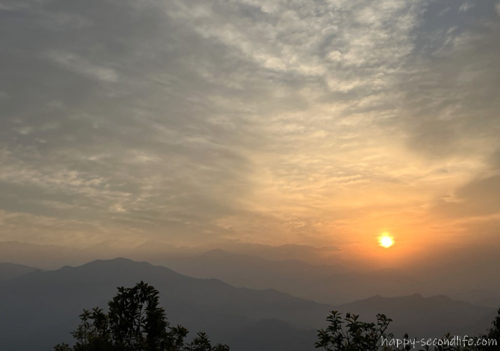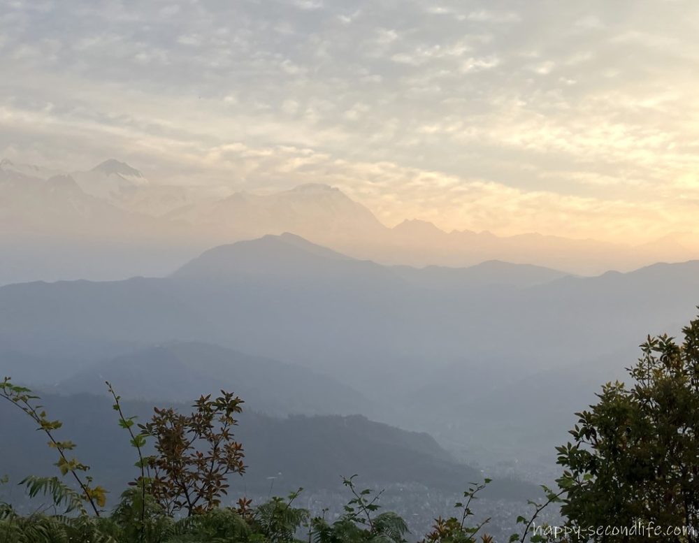 この日はわりと雲がありましたが、時々雲の切れ間から差し込む朝日とその光に照らされるヒマラヤ山脈を眺めることができました。