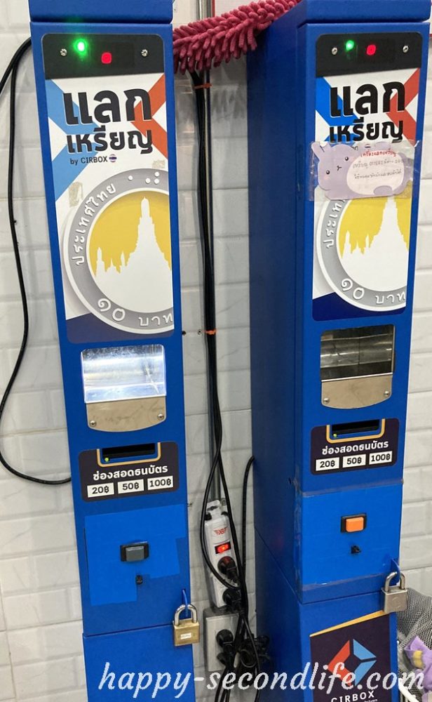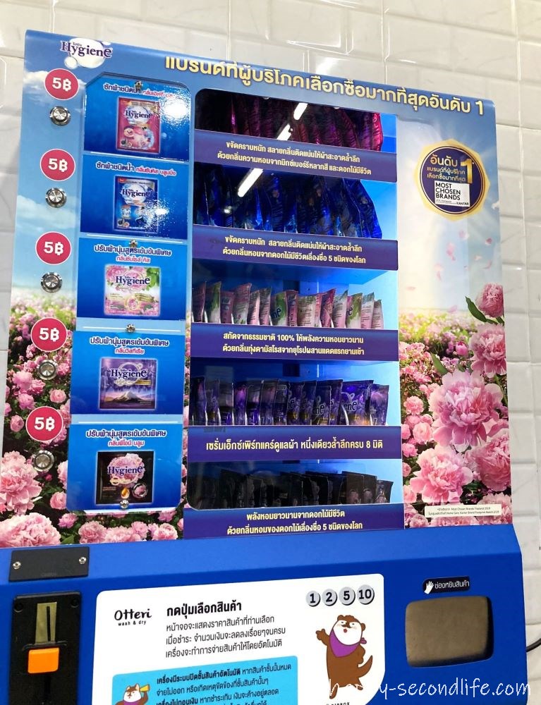 洗剤と柔軟剤はこの自販機で買えます。どちらも5バーツ。上の方が洗剤、下の方が柔軟剤です。