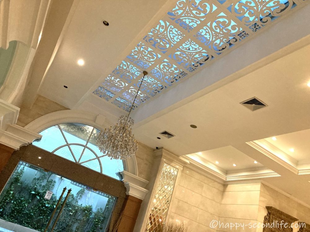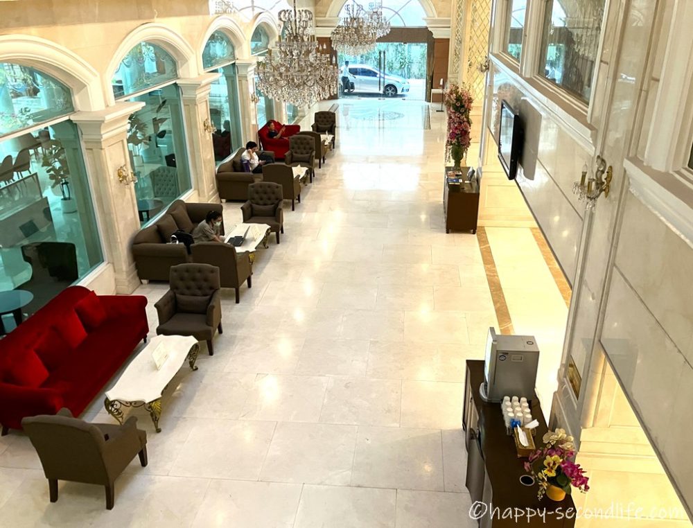 エントランスを入ると人造大理石の床がひんやりして気持ちのいい広いロビーです。無駄に広くてシャンデリアもあってちょっと変わった雰囲気ですが、元はデパートだったそう。