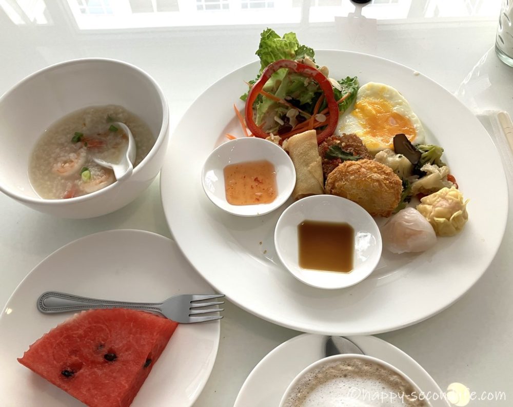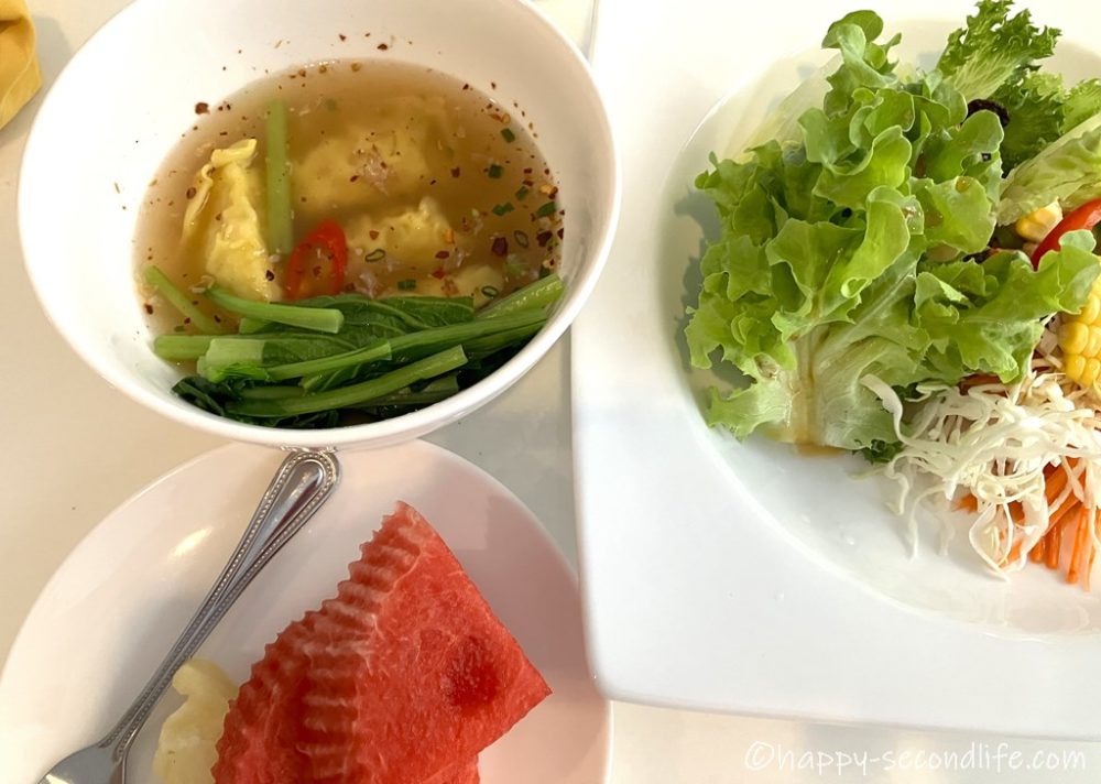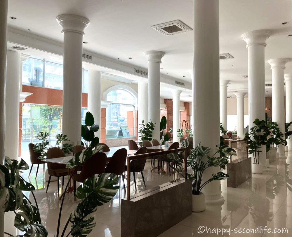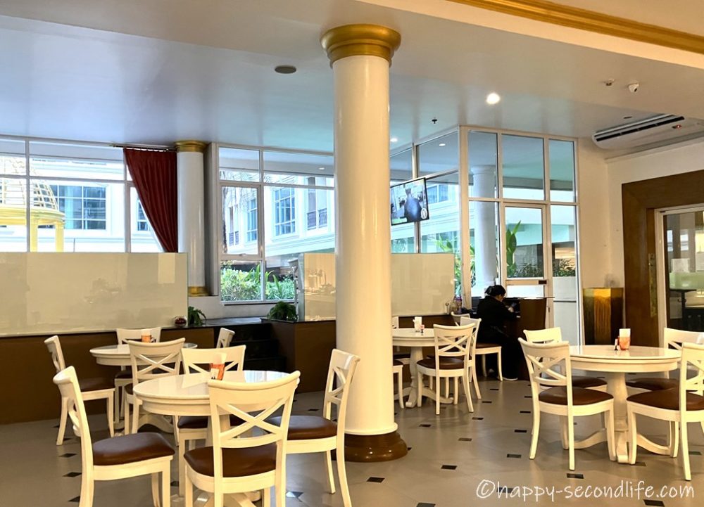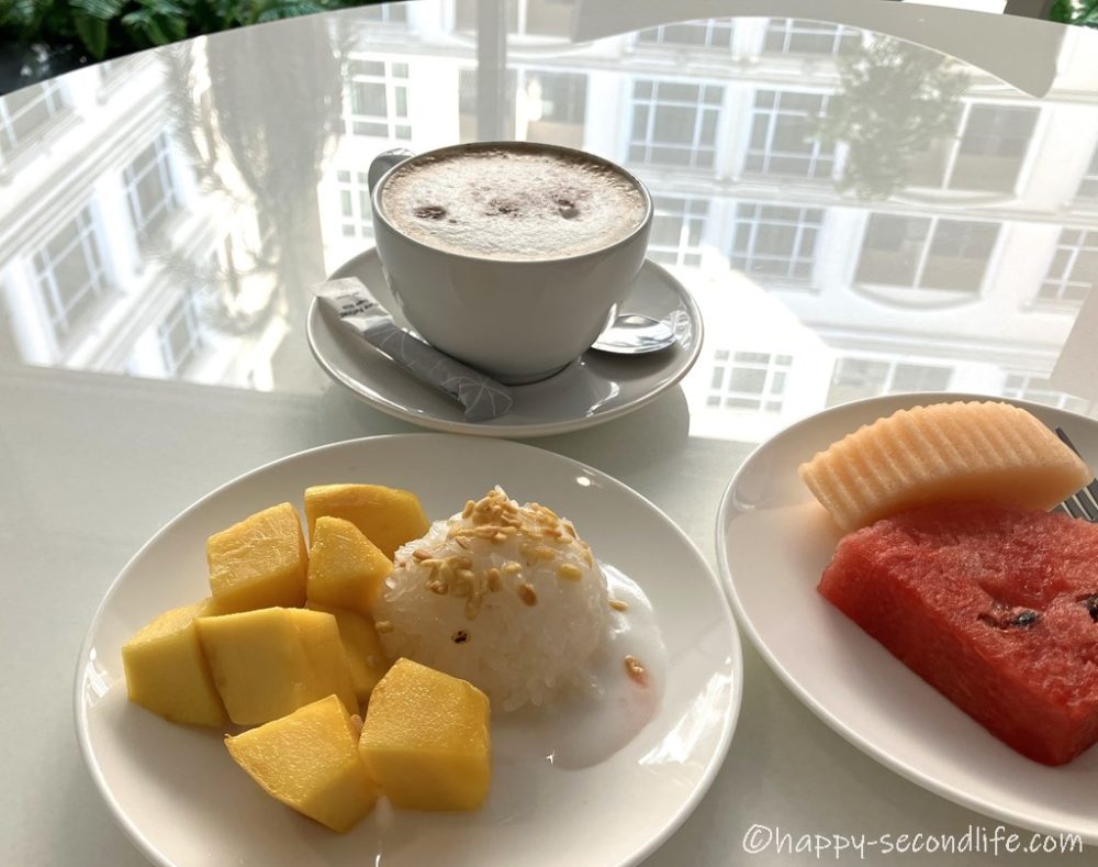 ちょっとうれしいのはウエルカムドリンクとケーキのサービスがあることです。ロビーにあるレストランでいただくのですが、タイにしては珍しく生クリームを使ってふんわりした日本のようなケーキです。