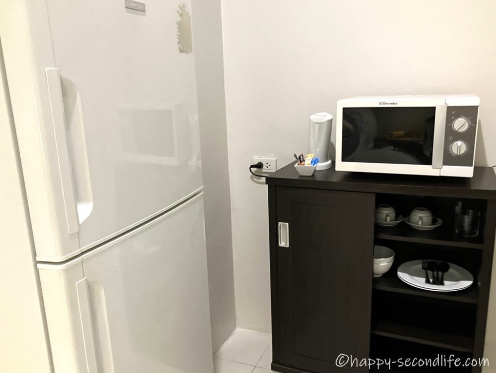 デラックスルームには大きな冷蔵庫と電子レンジ、電気ケトル、食器とカトラリーがあります。シンクやコンロはないので、調理はできません。