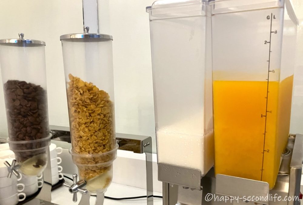 シリアルやジュース、飲み物など。特別なものはないけれど、中長期滞在の朝ご飯としては私は十分だと思います。
