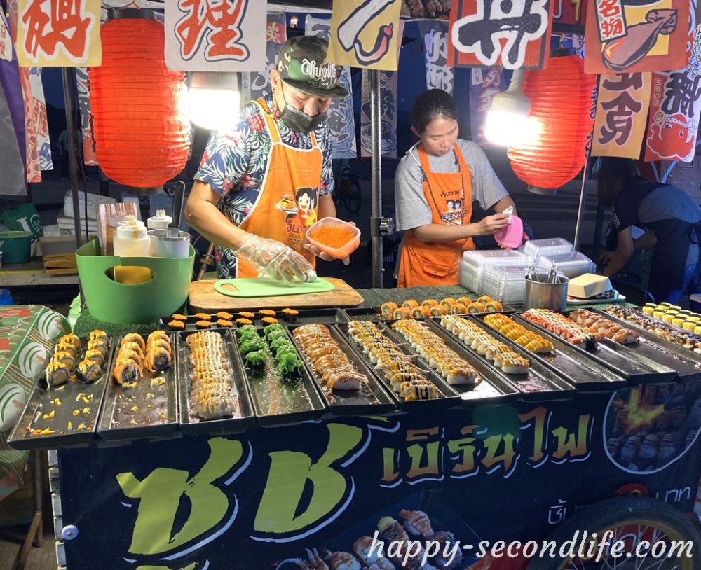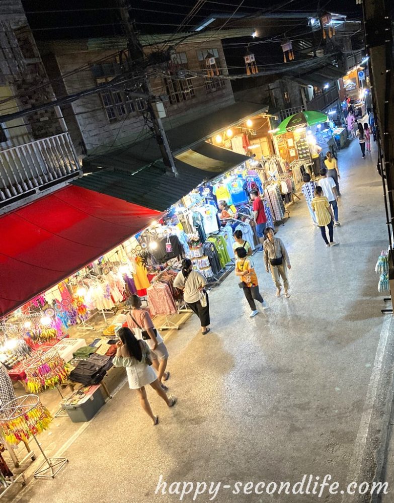 昼は店先にのんびりネコが寝ているような静かな通りですが、夕方からは露天や屋台が軒を連ね、タイ人観光客や現地の人でにぎわいます。オレンジ色の電灯にてらされたお店や通りは日本の夏祭りの風情で、昭和生まれの私にはなんとも懐かしい風景でした。