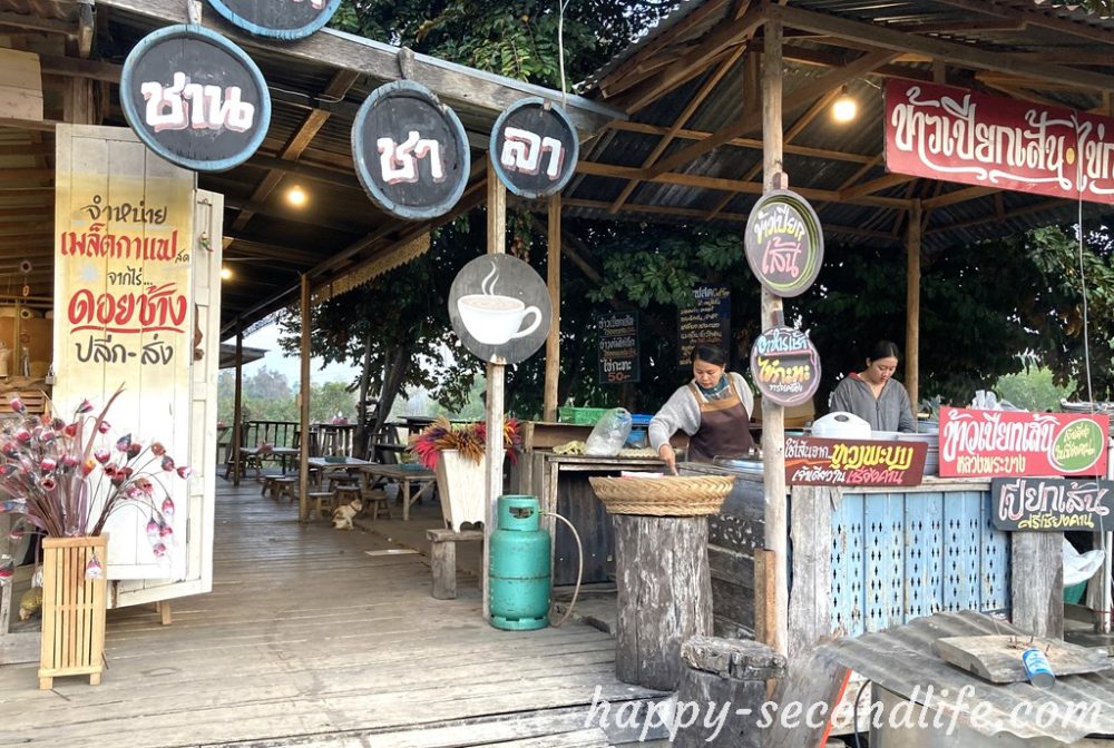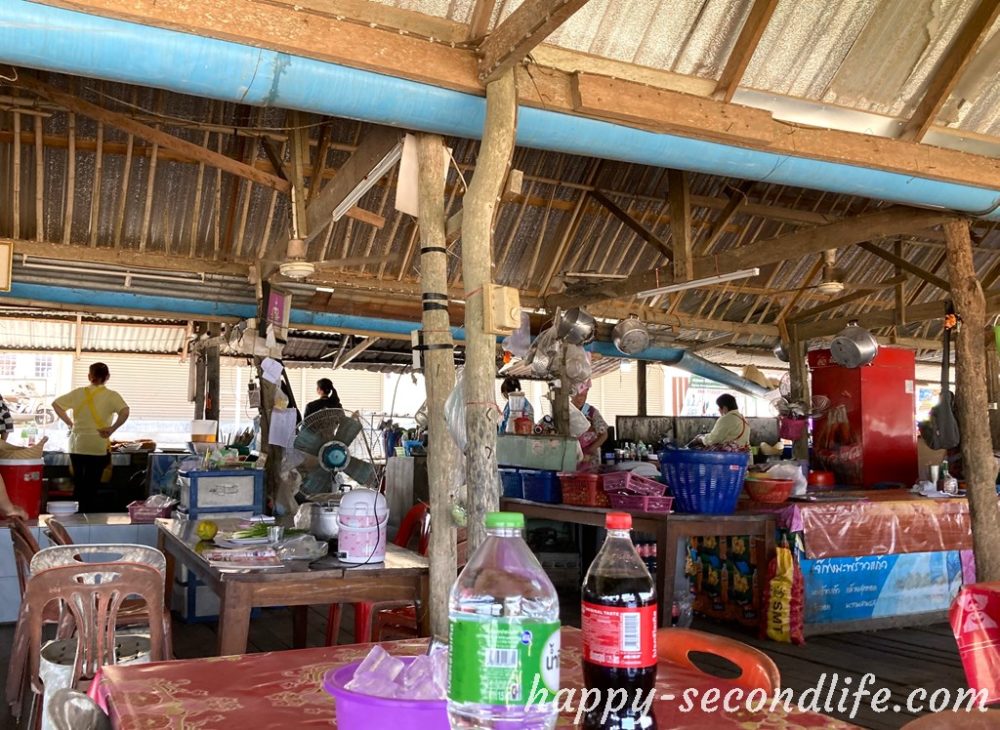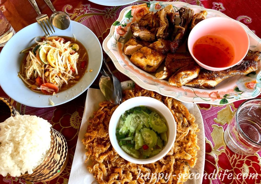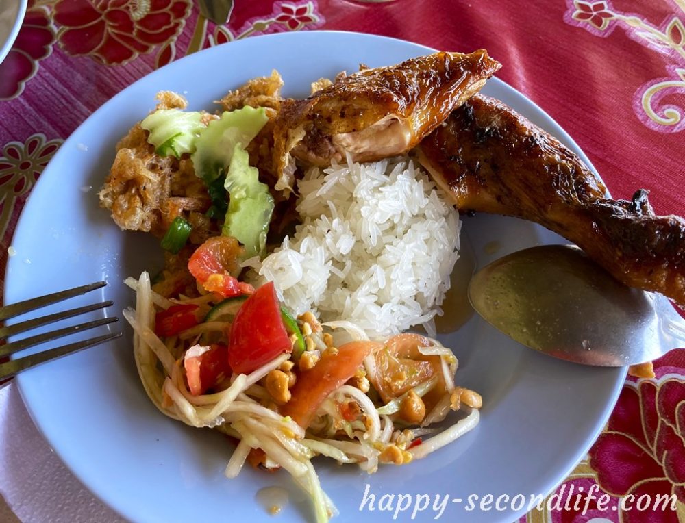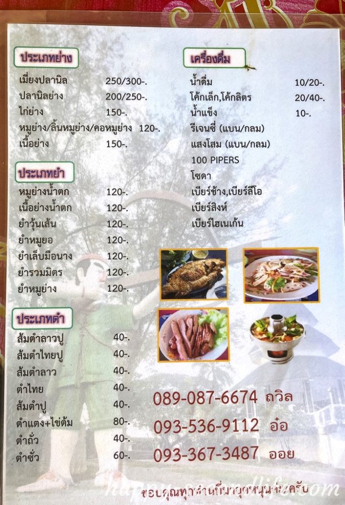 メニューはタイ語だけですが、最初から食べたいものを決めておいて、「〇〇ミーマイ?」(〇〇ありますか?)と聞くといいです。ガイヤーン、ソムタムあたりは必ずあります。ことばがわからないと食べられるメニューが限られてしまうので残念ですね。そういう人はGoogle翻訳でメニューを写して内容を見ながら注文するといいと思います。私はこのスタイルでした。