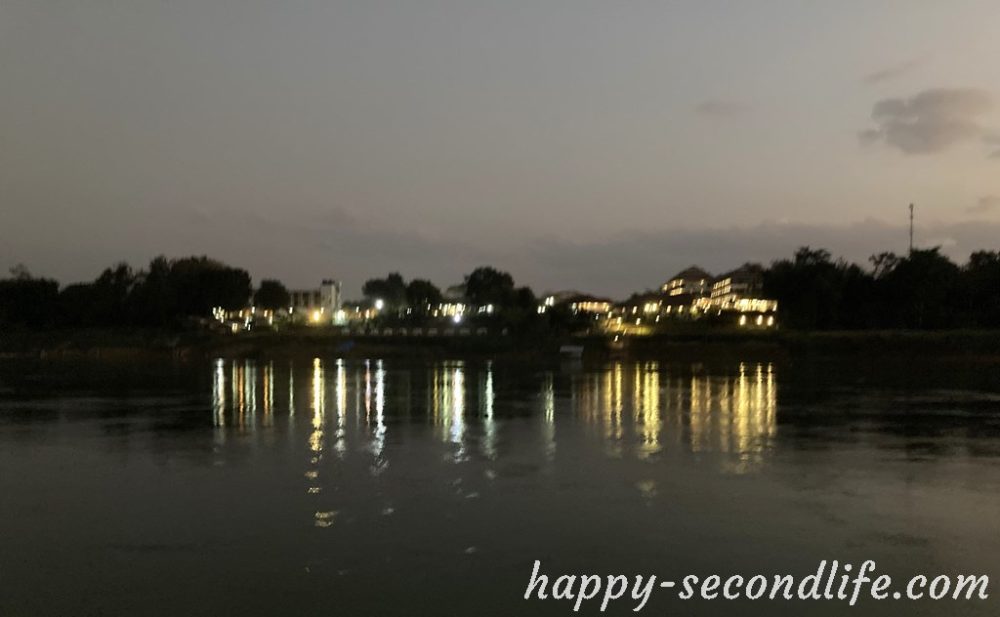 すっかり日が暮れて空は暗くなりました。タイ側の岸の灯りがきれいです。ラオス側は人が住んでいないのか、真っ暗でした。
