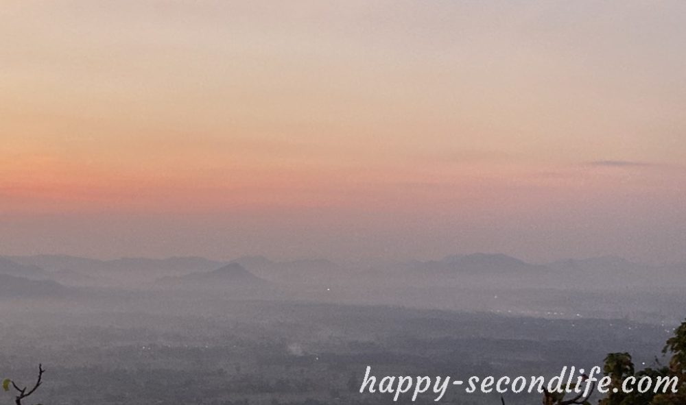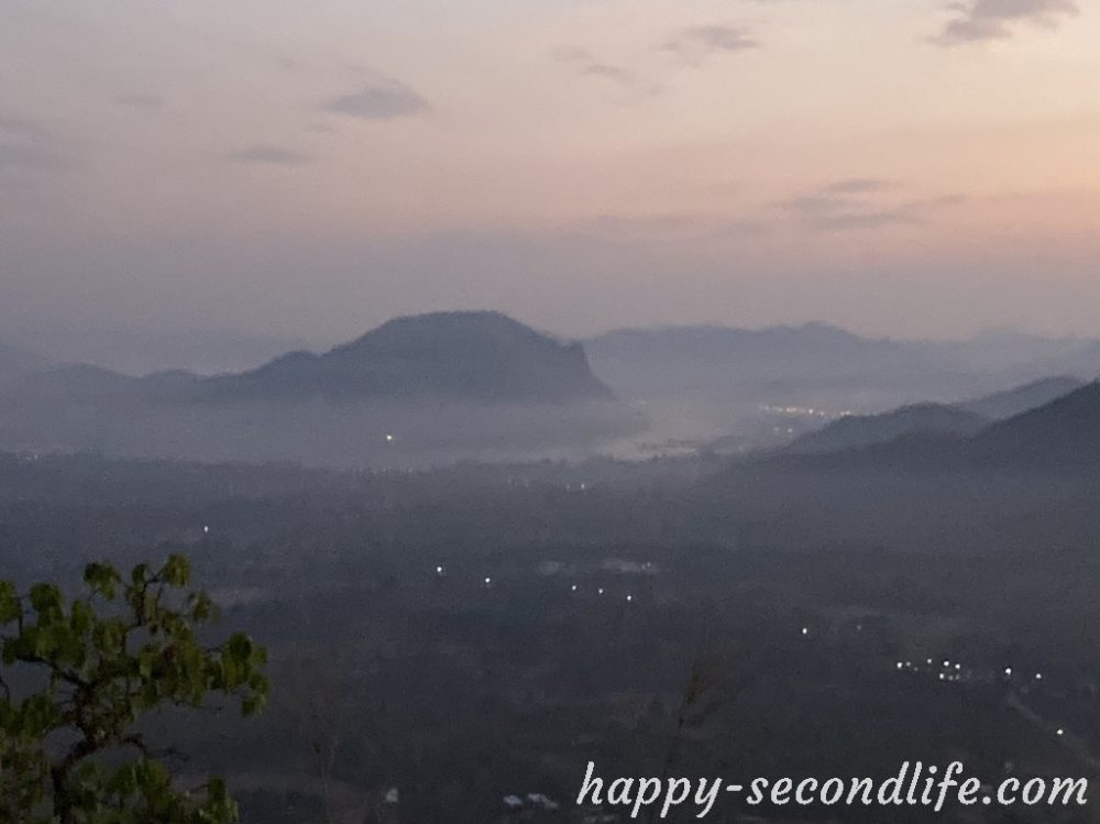 山頂に着いてもまだあたりはほの暗く、うっすらとオレンジのもやがかかっています。街の灯りはまだついています。